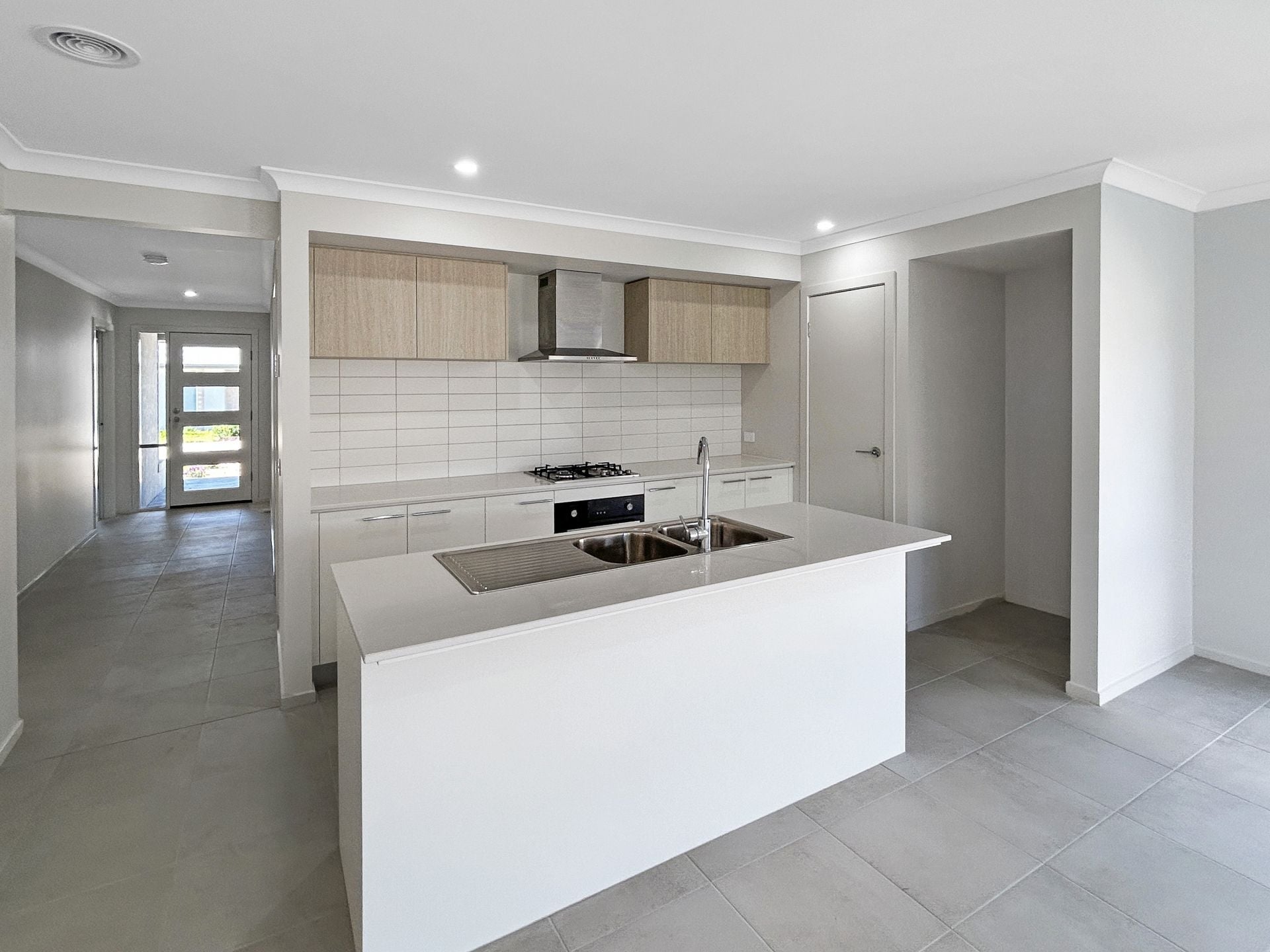 Kitchen containing stainless steel appliances including gas cooktop and electric under bench oven and dishwasher, pantry and island bench.