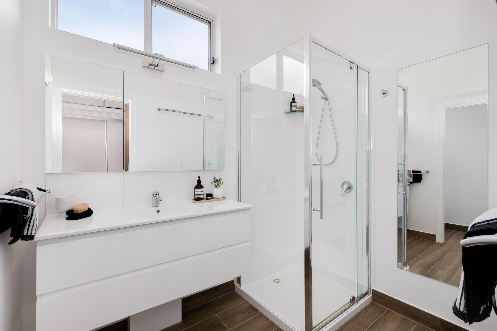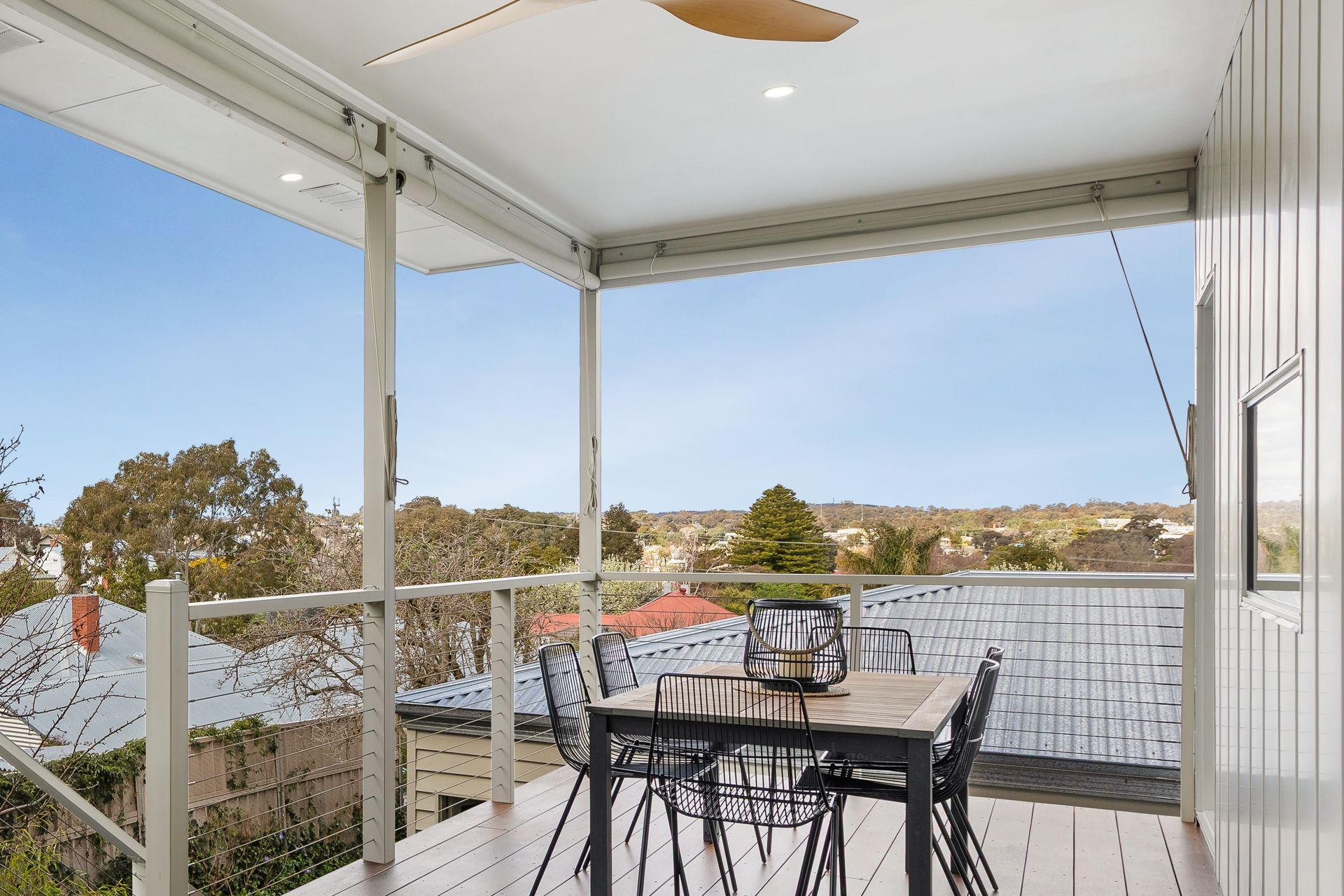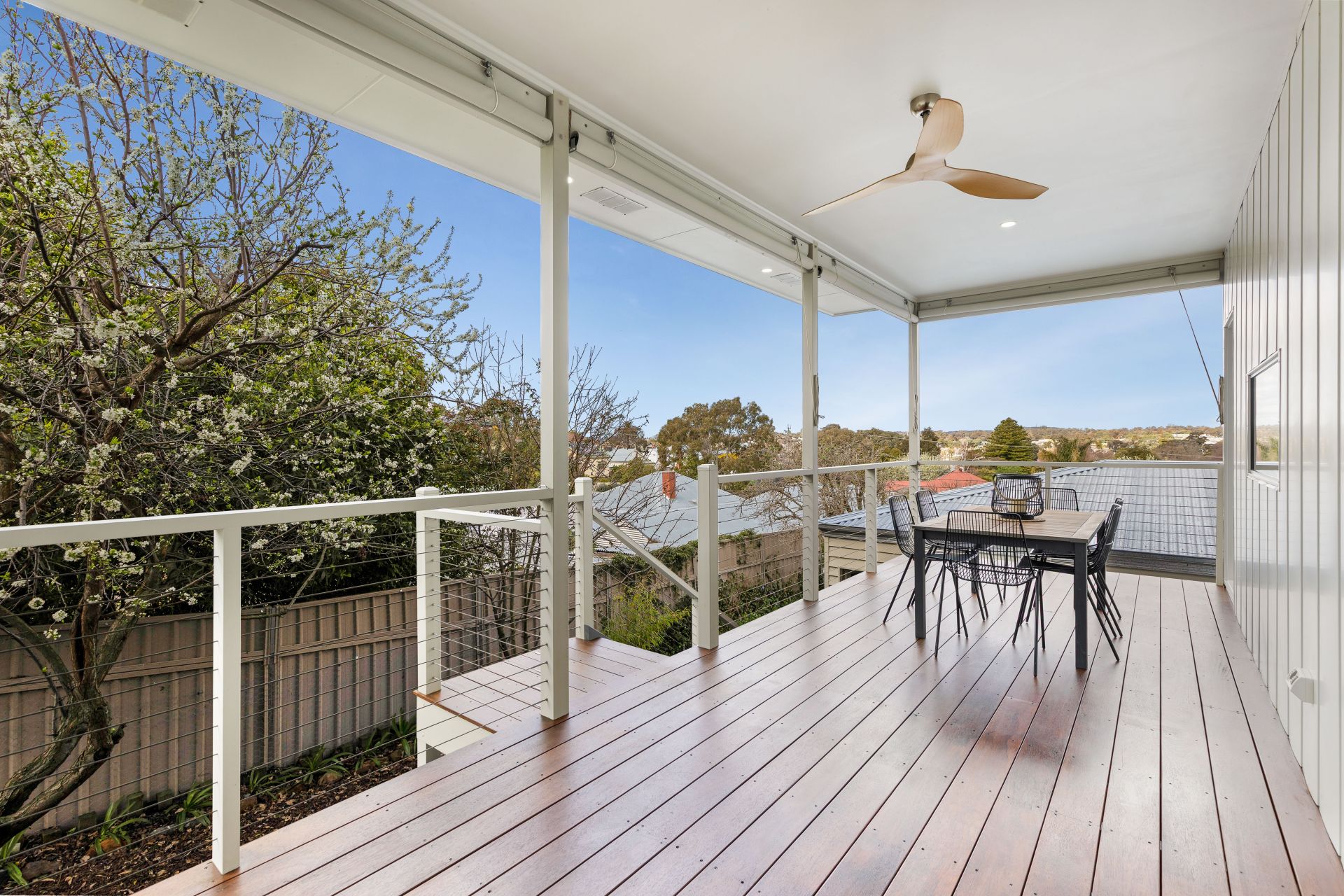 The layout includes two upstairs bedrooms, with the master offering a generous walk-in robe and ensuite. Downstairs, a large, flexible space can easily serve as a third bedroom, home office, gym, or studio. The spacious kitchen is beautifully finished with stone benchtops, soft-close drawers and cabinetry, and quality electric appliances-all installed new during the renovation. A highlight of the home is the elevated alfresco balcony at the rear, offering sweeping views across to One Tree Hill. It's an ideal setting for outdoor dining, entertaining friends, or relaxing while watching Bendigo's city fireworks.