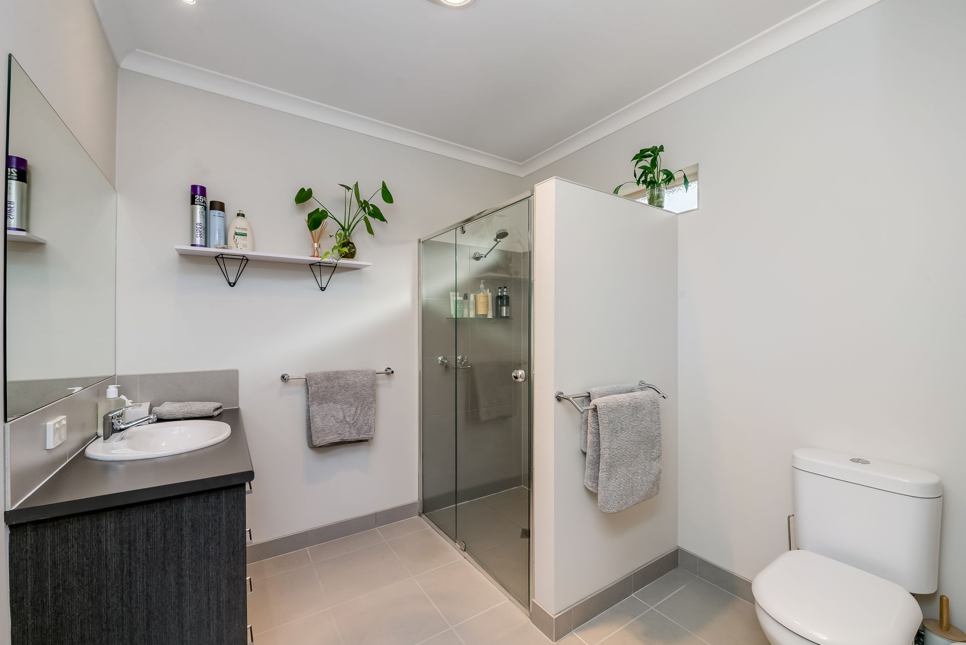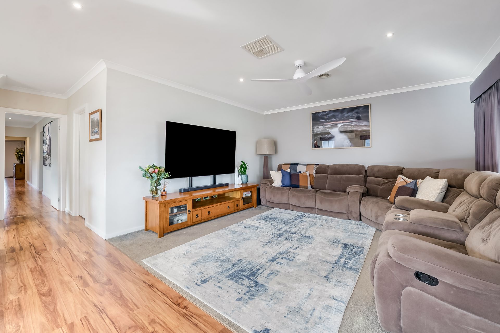 From the moment you step inside, the wide entrance and timber-look laminate flooring create an inviting first impression. To the right, the spacious master bedroom features a generous walk-in robe and a stylish ensuite complete with a double shower.