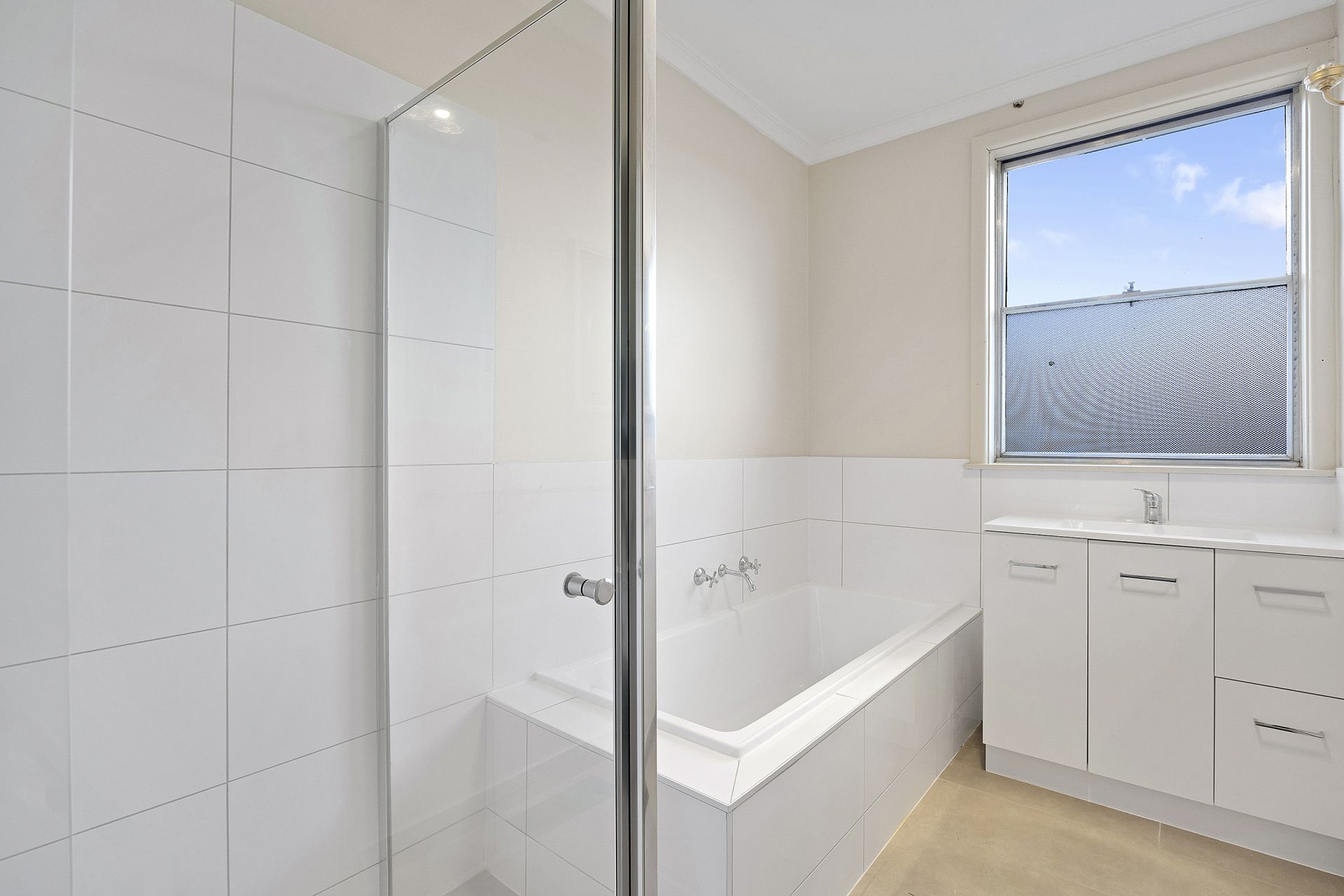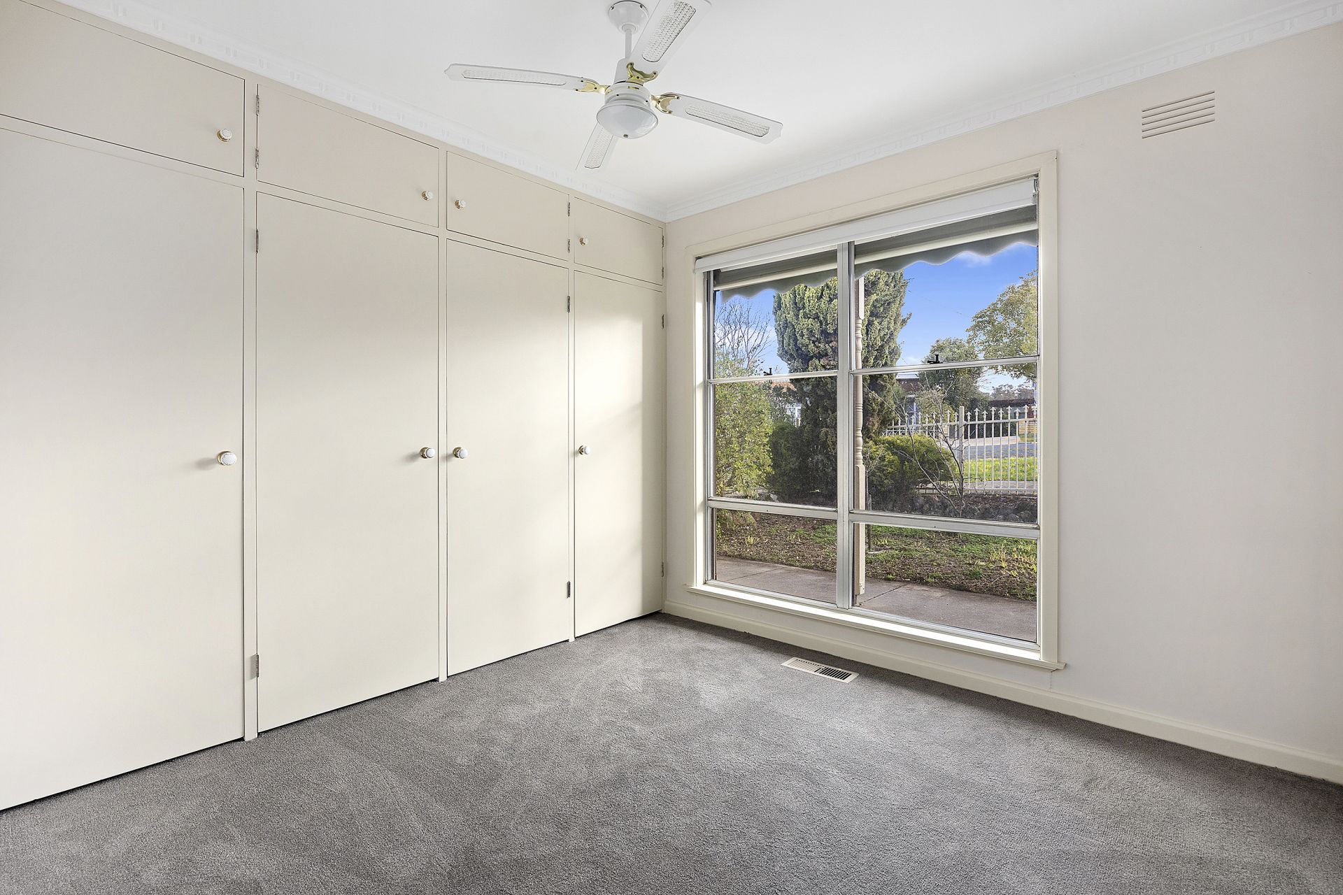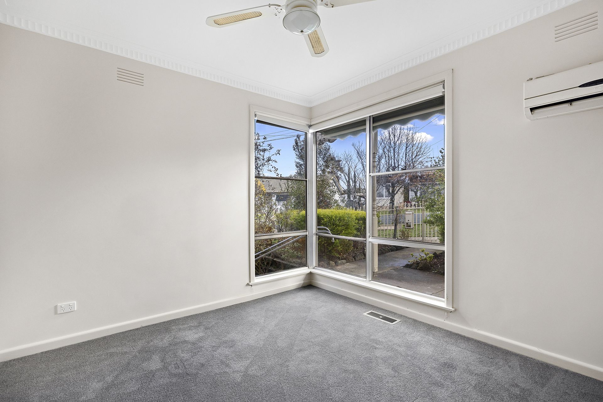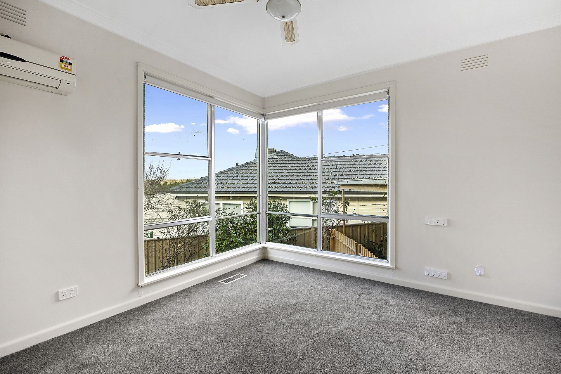 Three generously sized bedrooms each include a full wall of built-in robes and ceiling fans, with two also featuring split systems and unique corner windows that allow in plenty of natural light. The sparkling newly renovated bathroom adds to the home's appeal.