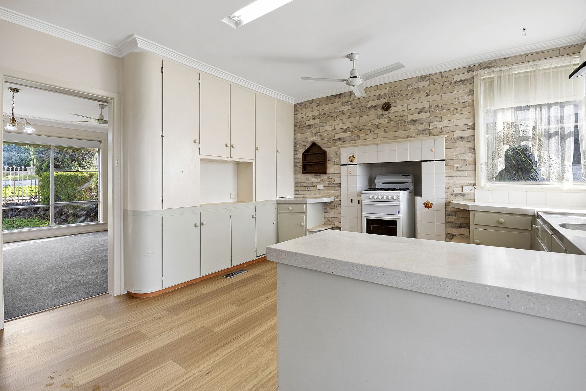 The kitchen, largely original with a few tasteful updates, features stone benchtops, a tiled alcove, and a modern upright stove. Banks of cabinetry offer excellent storage, and the leafy view from the sink makes even everyday tasks a pleasure.