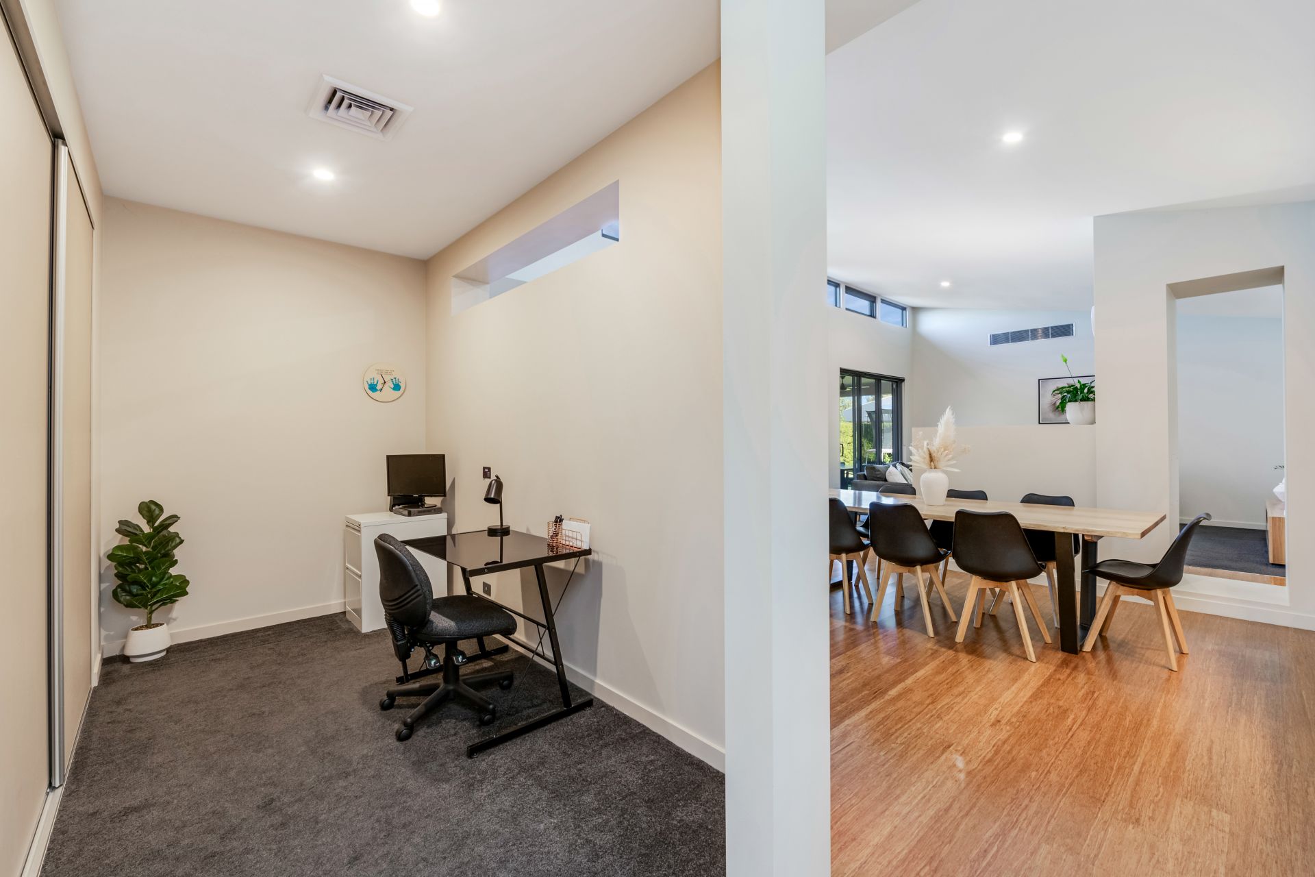 A dedicated study includes cupboards and built-in cabinetry for home-based workers or students.