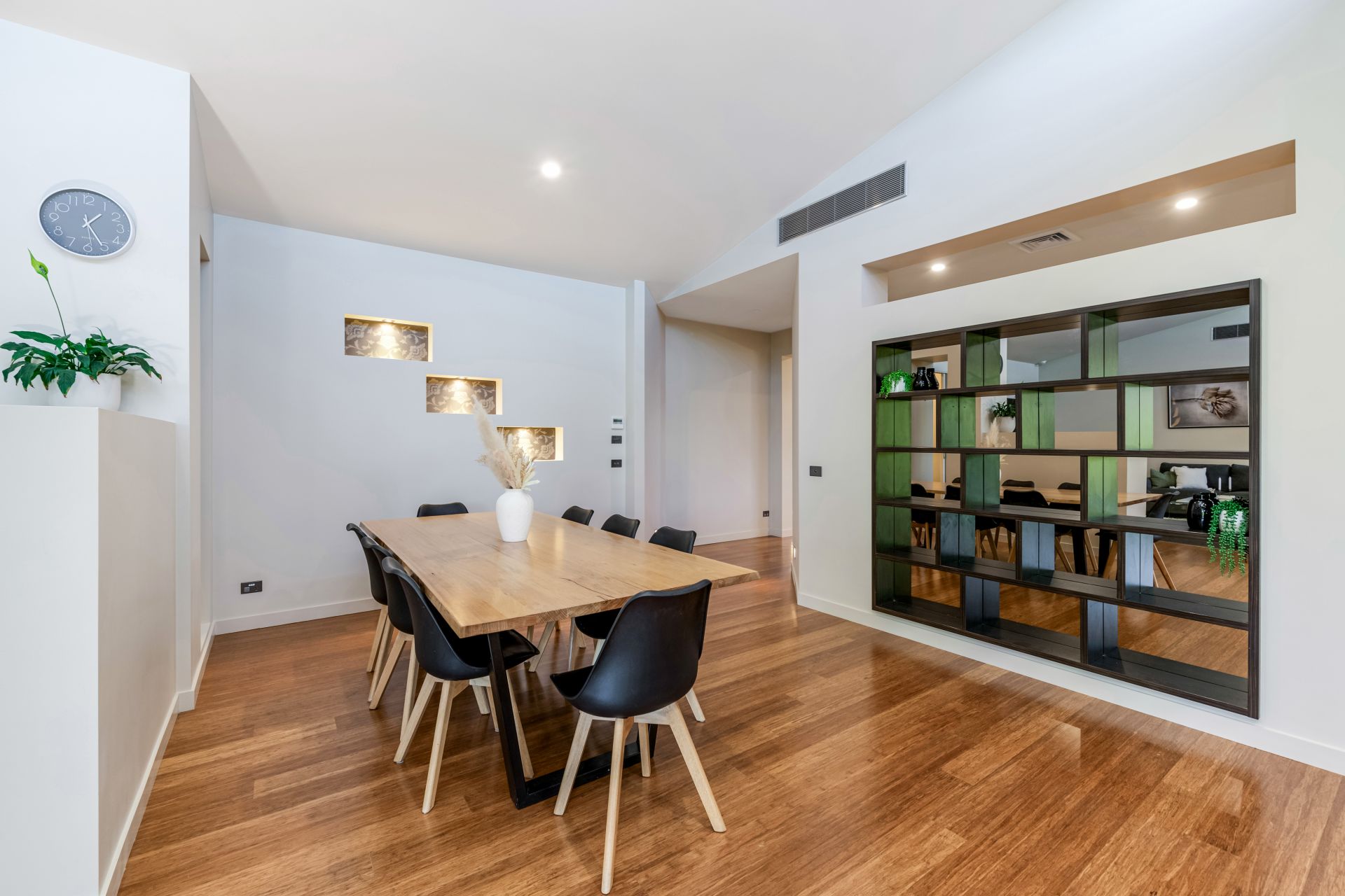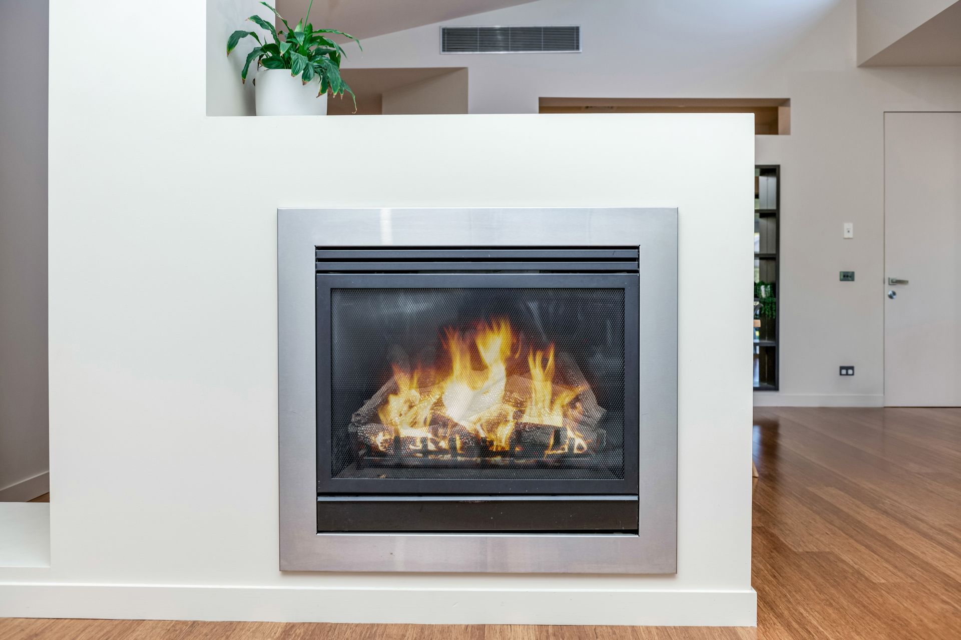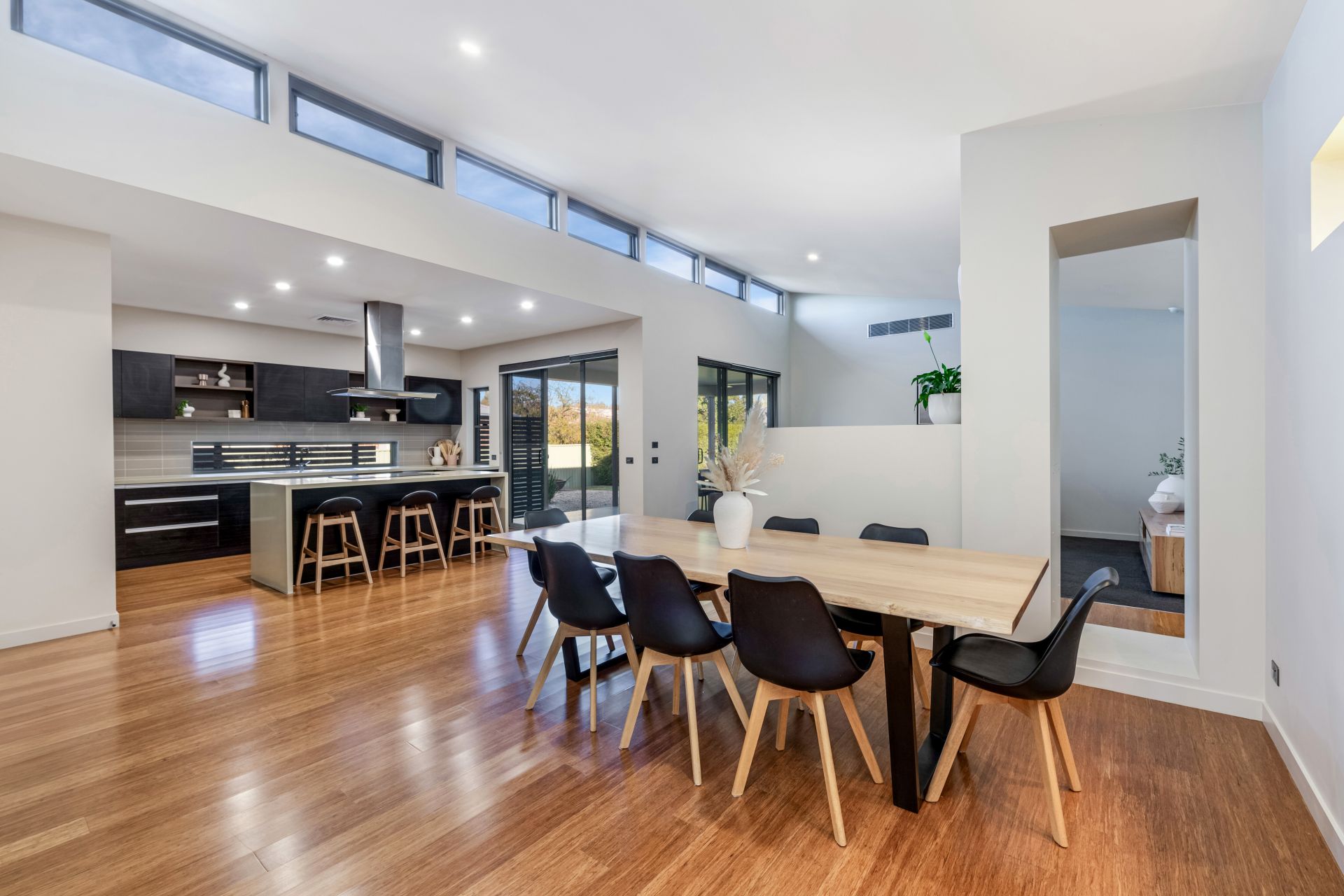 The large family living room is filled with natural light courtesy of high clerestory windows and the raked ceiling height, while a gas log fire adds a cosy ambience.