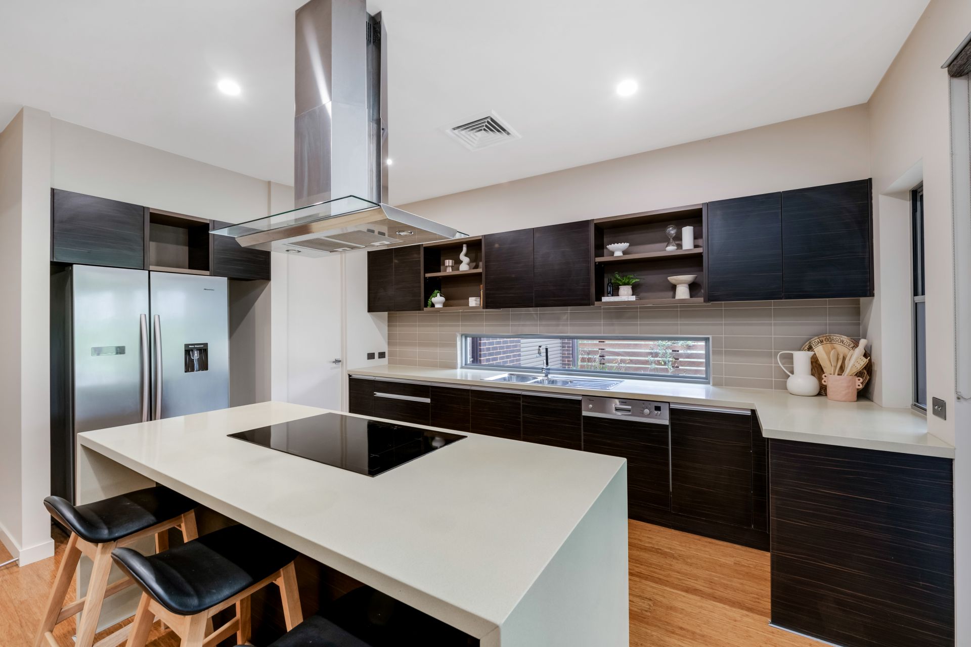 Enjoy large-scale entertaining in the spacious heart and soul of the home – the open-plan family living, dining and kitchen areas. The kitchen is a chef's delight featuring a window splashback behind a 900mm induction cooktop, an electric under-bench oven, a Bosch dishwasher, plentiful soft-close storage, and a walk-in pantry. The ample waterfall-end, stone-topped island provides plenty of room for meal prepping and casual dining.