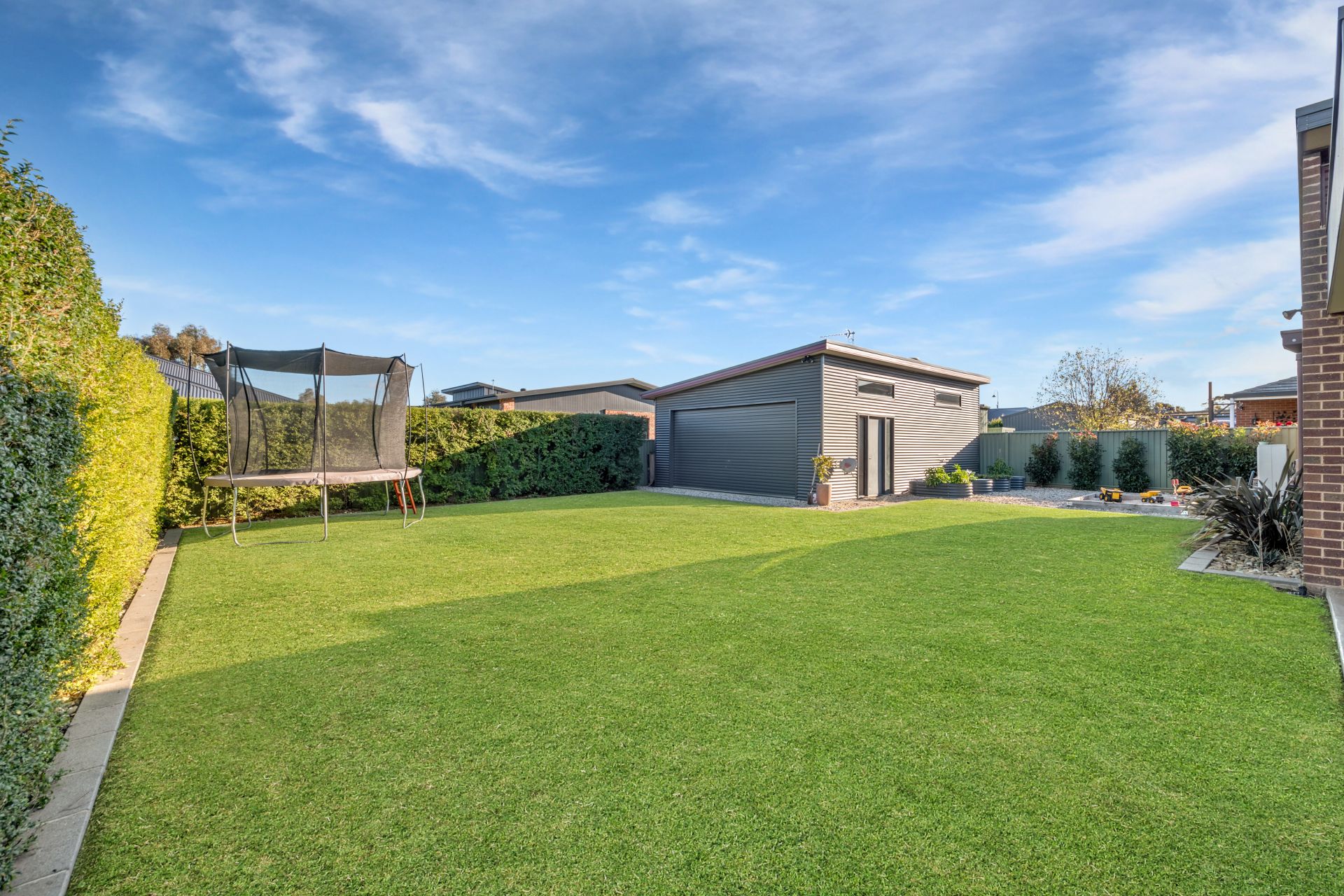 The private and secure backyard includes a 9m x 6m powered Colorbond shed/studio/workshop with workbenches, a sink and ceiling fans.