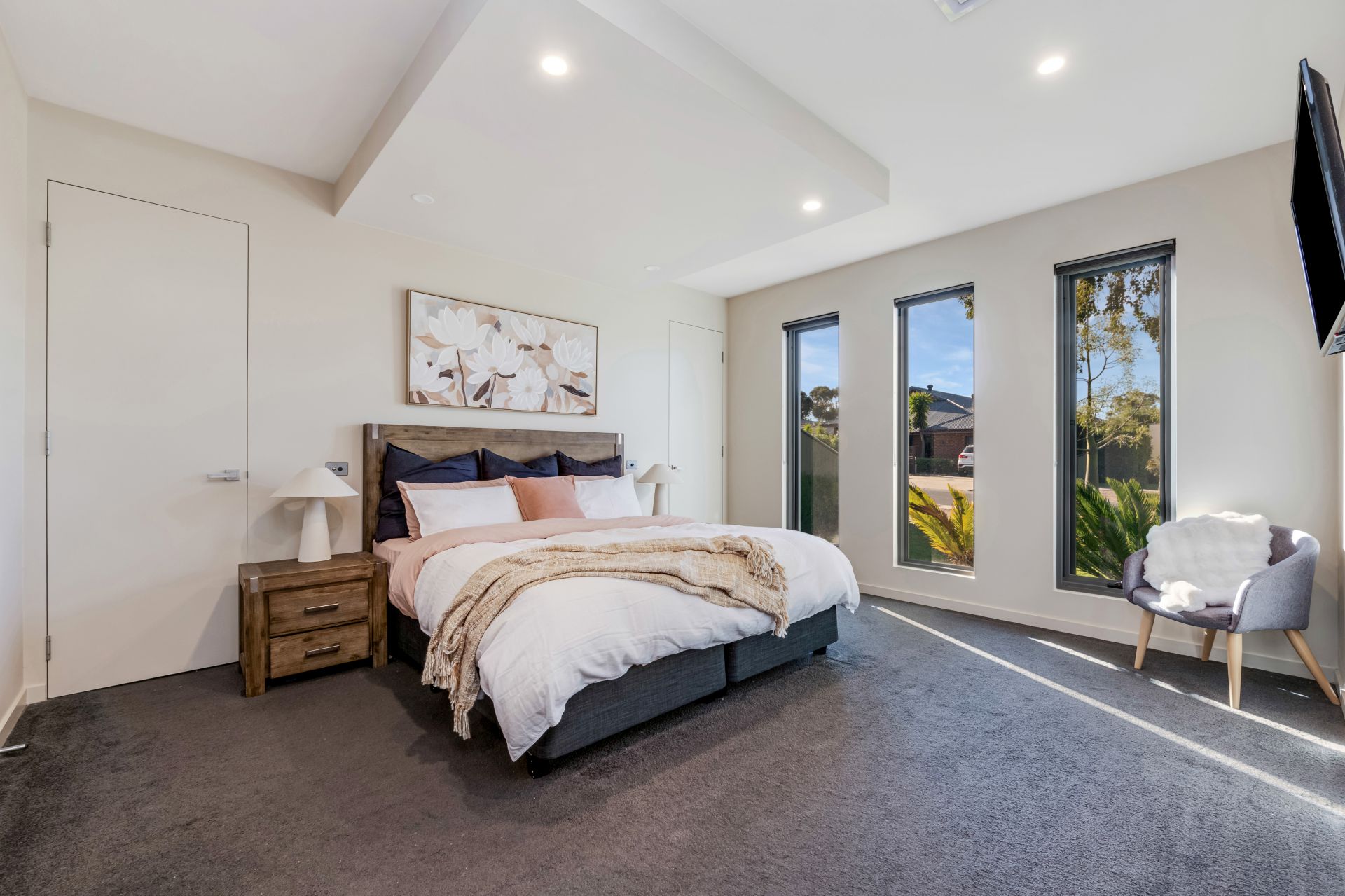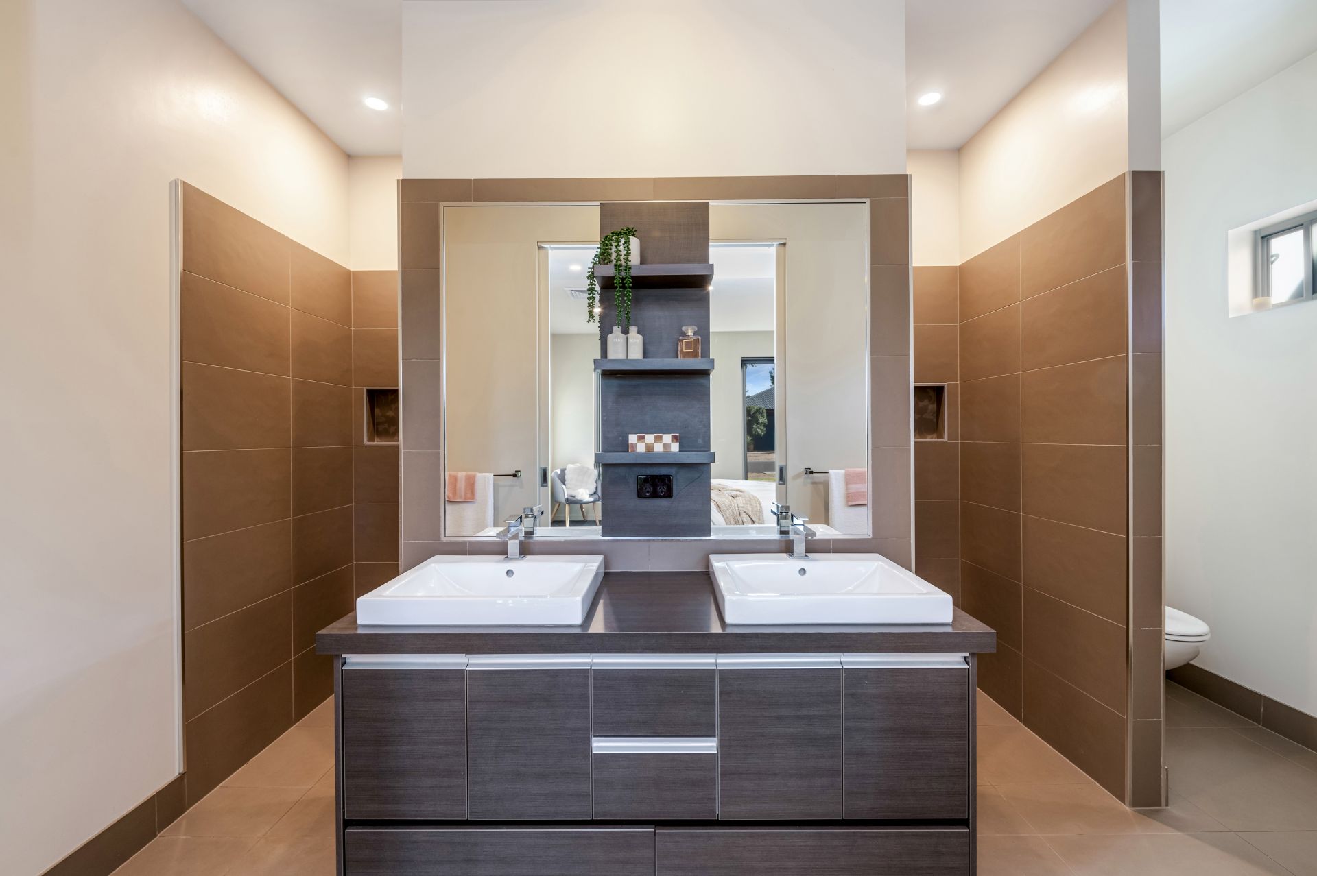 The oversized master suite across the hallway boasts a walk-through robe and a stylish ensuite with a walk-in double shower, twin vanity basins and a separate WC.