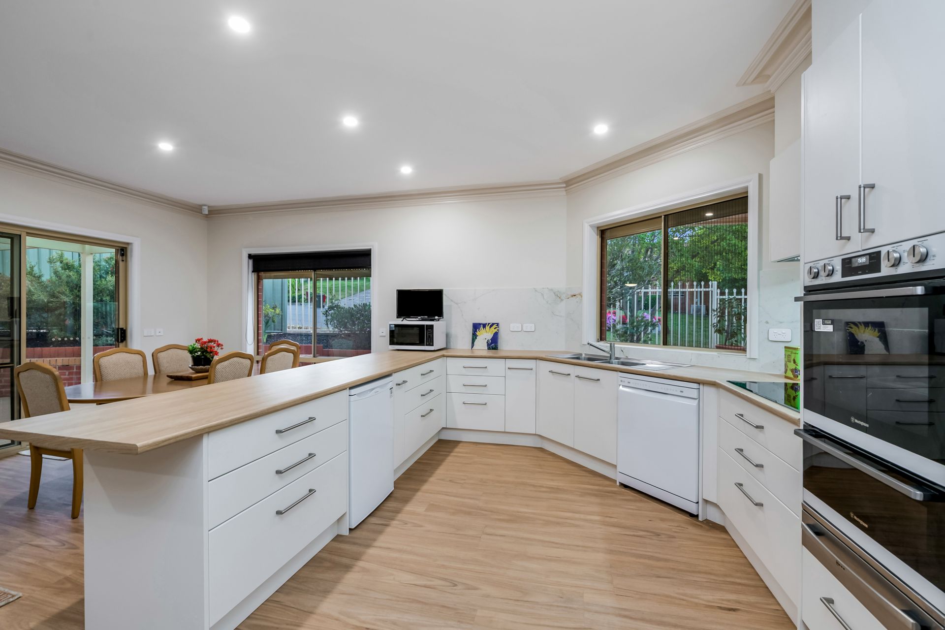 Inside, sophistication meets functionality. The brand-new kitchen showcases premium appliances, including a Bosch induction cooktop sitting underneath a silent Schweigen rangehood, Westinghouse double oven and freestanding under the counter fridge as well as a Neff warming drawer. Italian v stone porcelain splashbacks are found throughout the wet areas of the home, walk-in pantry and sleek contemporary finishes complete this elegant culinary space.