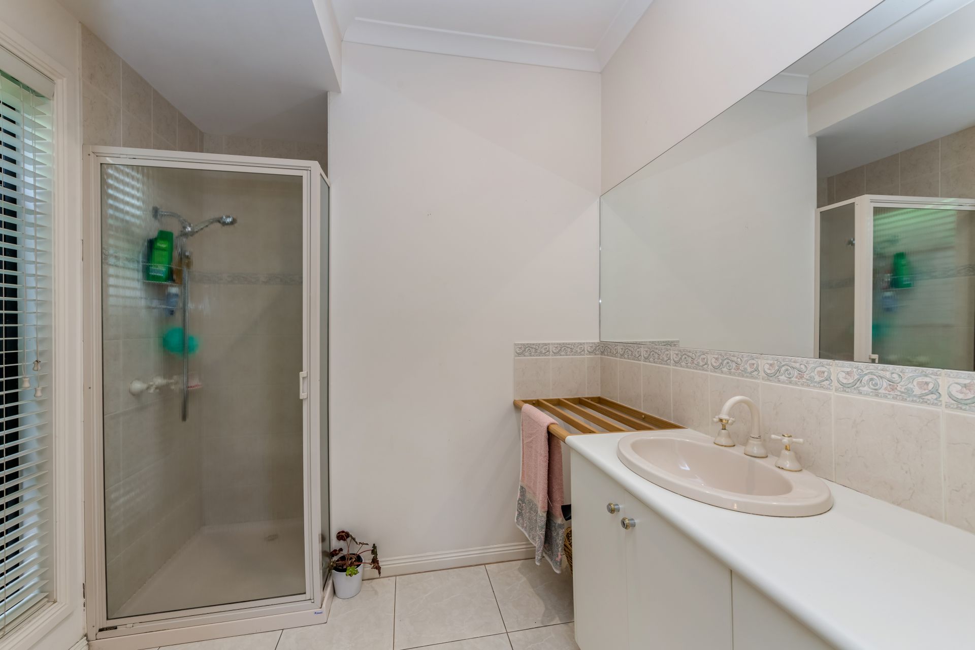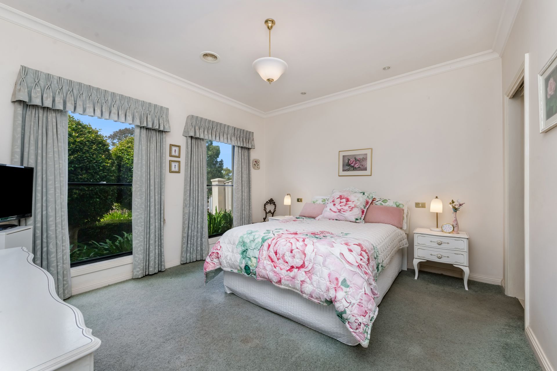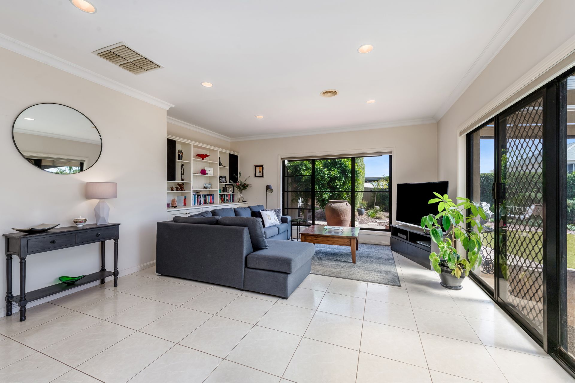 Across the hallway, the main bedroom, with an ensuite and a walk-in wardrobe, overlooks the attractive front gardens. The open-plan kitchen, spacious dining area and large living room are filled with Northern light and garden views courtesy of large windows. The kitchen includes the popular combination of a gas cooktop and electric wall oven, a Bosch dishwasher and plenty of storage, including an appliance cupboard and a double pantry. Two more robed bedrooms, the main bathroom and the laundry complete the interior.